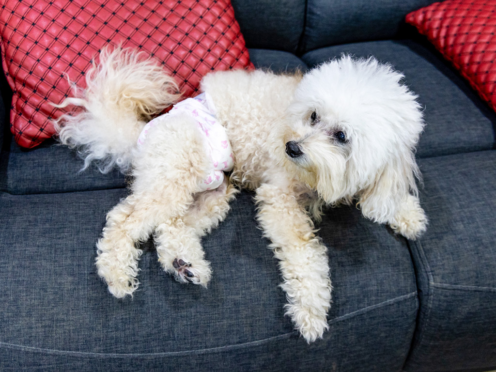 Многие владельцы используют памперсы для собак в дни течки, чтобы сохранить чистоту дома и избежать следов на мебели и полу.